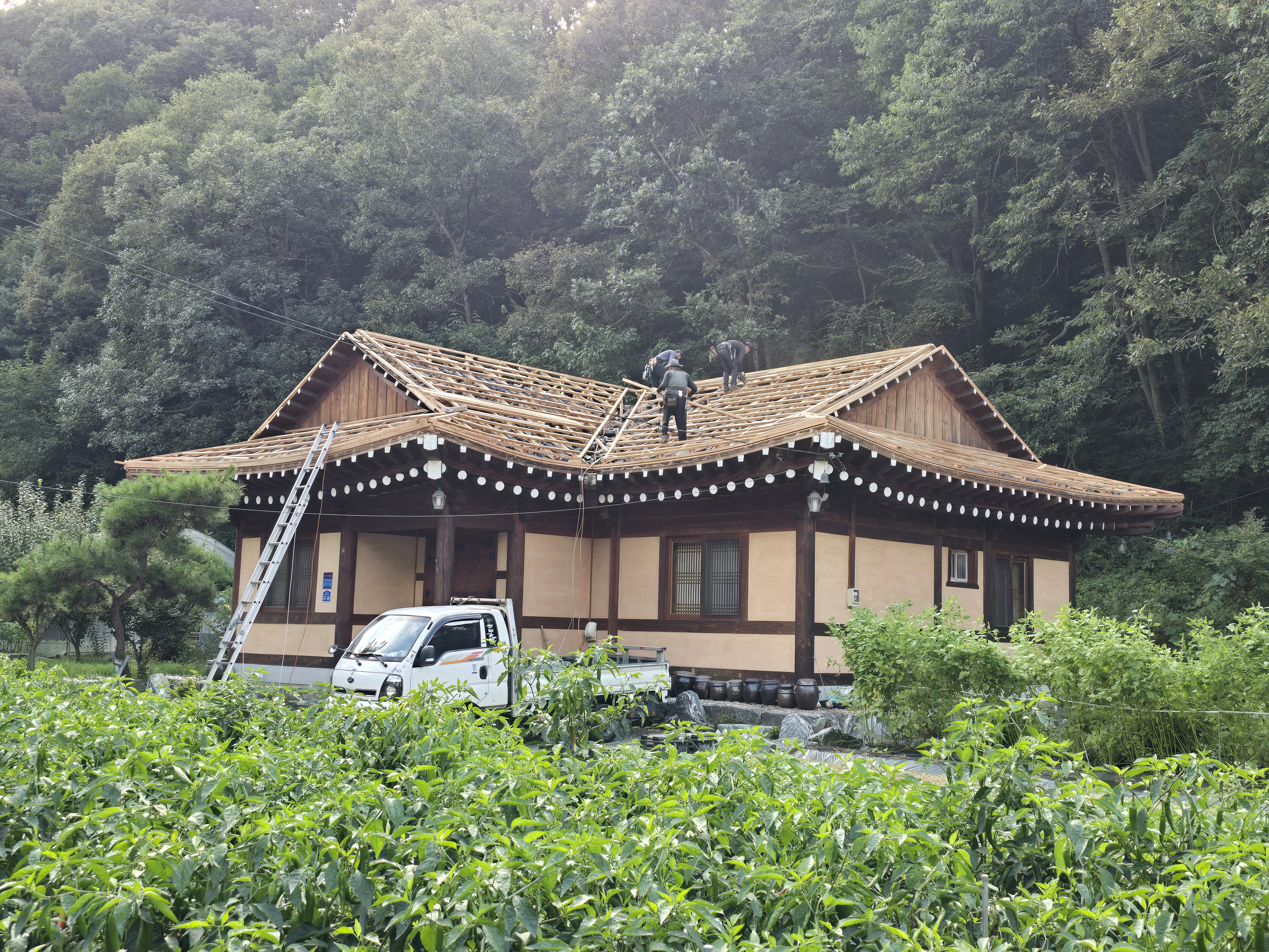 홍천군 서면. 비가 새는 전통기와 지붕을 아연도칼라강판 대골 전통기와로 덧방 시공함.
